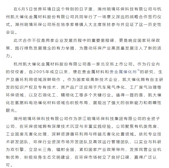 世界環(huán)境日,簽約啟新程 | 明境環(huán)保與凱大催化達成戰(zhàn)略合作
